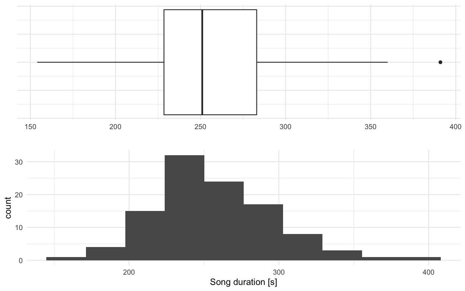 The above boxplot and histogram show an approximately normally distributed data. In order to make sure that we do not have outliers, we investigate the songs with the minimum and maximum duration.