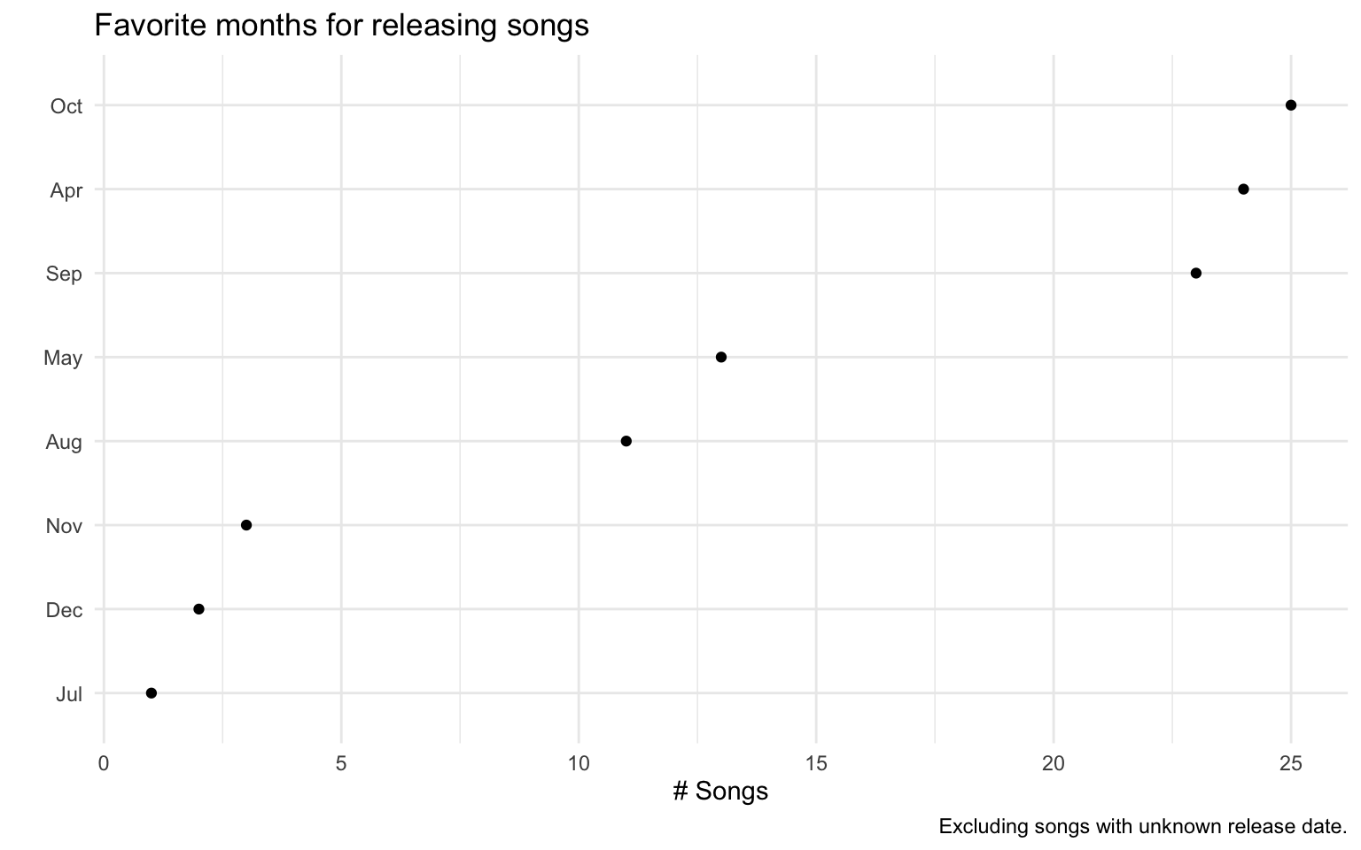 The first plot which might be suitable to answer the question is a time-series plot, binning the release date to year and month and ignoring the day. Unfortunately, this time-series plot results in a busy graph with no clear pattern. To solve the problem, we aggregate the data by month. Sorting the months descending, we can make out the most popular month for releasing songs. The data in question is of categorical (album) and ordinal (number of songs) nature, a dot plot sorted by the number of songs is sufficient for this task.