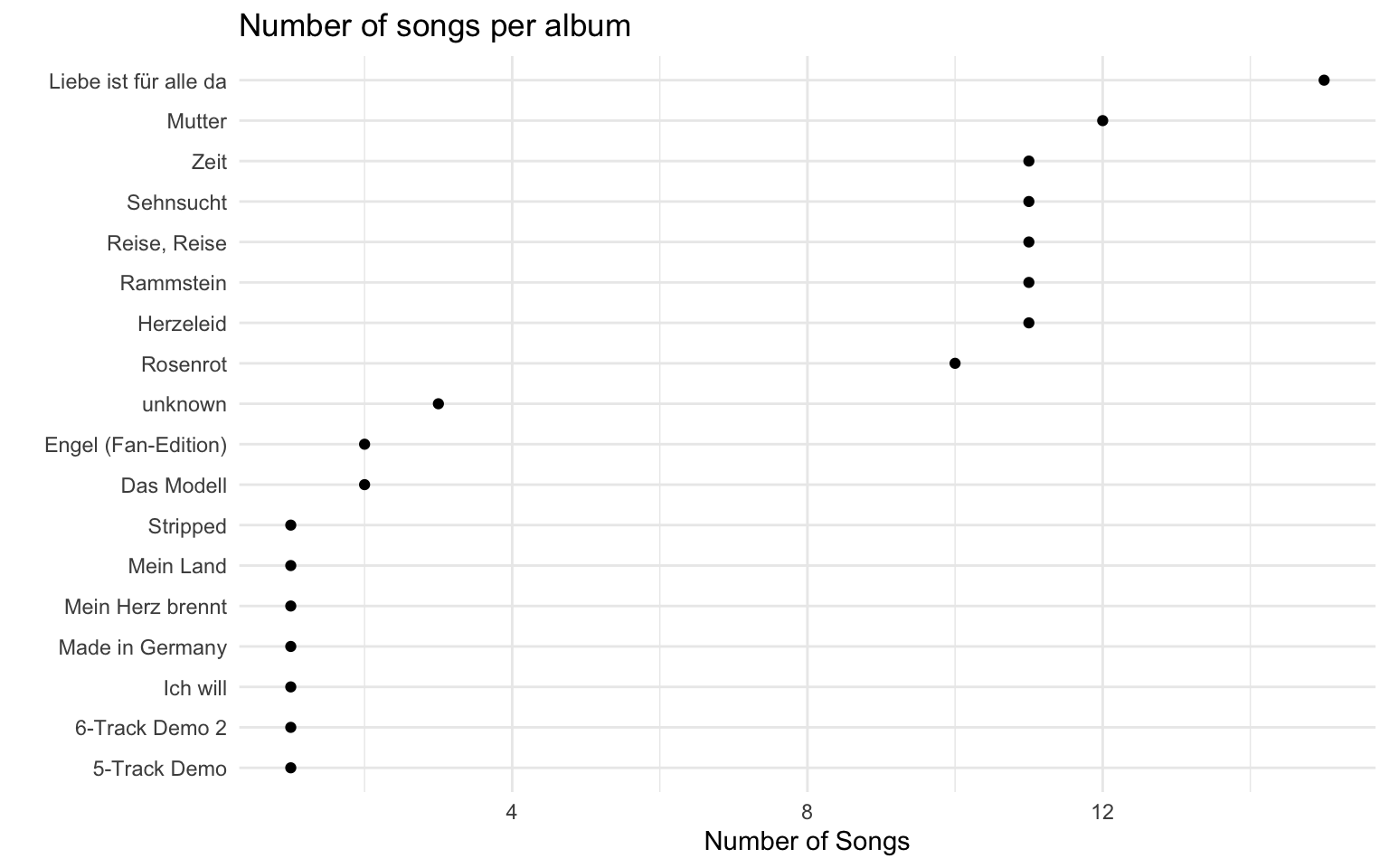 This project analyzes songs produced by the German band Rammstein. What characterizes these songs and how do they compare to each other? will be one question we want to answer. Another one focuses on the change over time, such as did the songs become shorter?