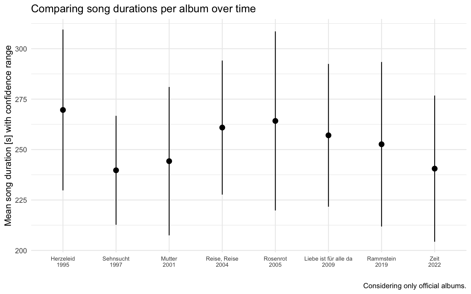 These are also the officially released albums. We continue the investigation by comparing the song durations of each album over time. When we are mainly interested in the song duration plus confidence interval, per album over time, we have to deal with three components. But a trick allows us to combine the album and time components by concatenating these two pieces of information. Now we have a qualitative ordinal feature (album + release year) and a quantitative feature (mean + confidence interval). The time-representative component is drawn on the x-axis. Utilizing a pointrange geometry for visualizing the quantitative features (mean + confidence interval) we end up with the following figure: